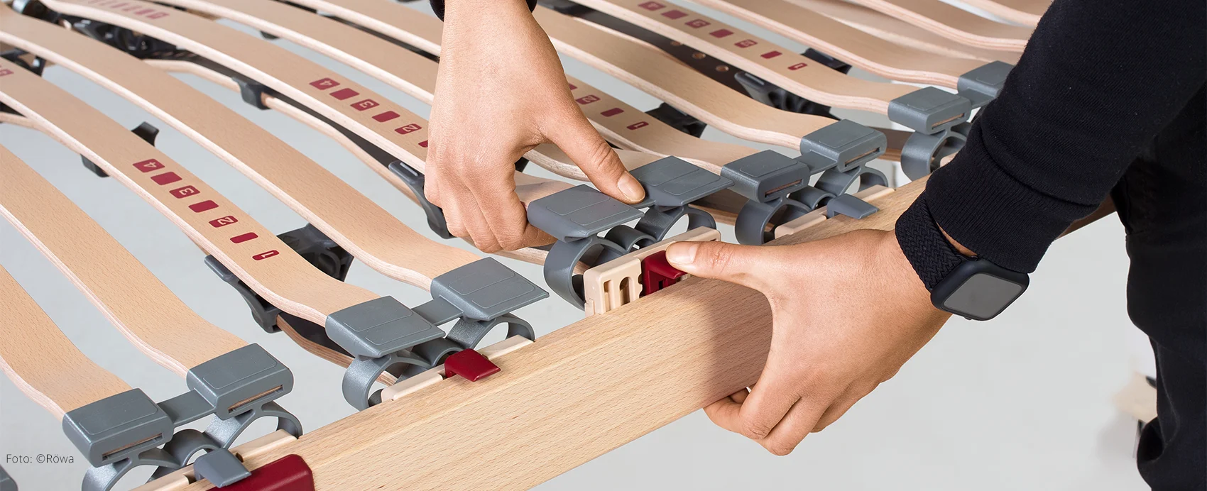 - Die Röwa-Lattenroste sorgen mit den patentierten Doppelschwungleisten für optimale Belüftung und Hygiene des gesamten Bettsystems.